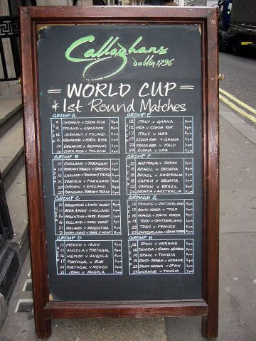 ![]() パブの前にはこんな看板がいくつも。 イギリス人のサッカー熱は凄い! I saw some such signboards in outside of pubs. Many English people are enthusiastic about football games ! |